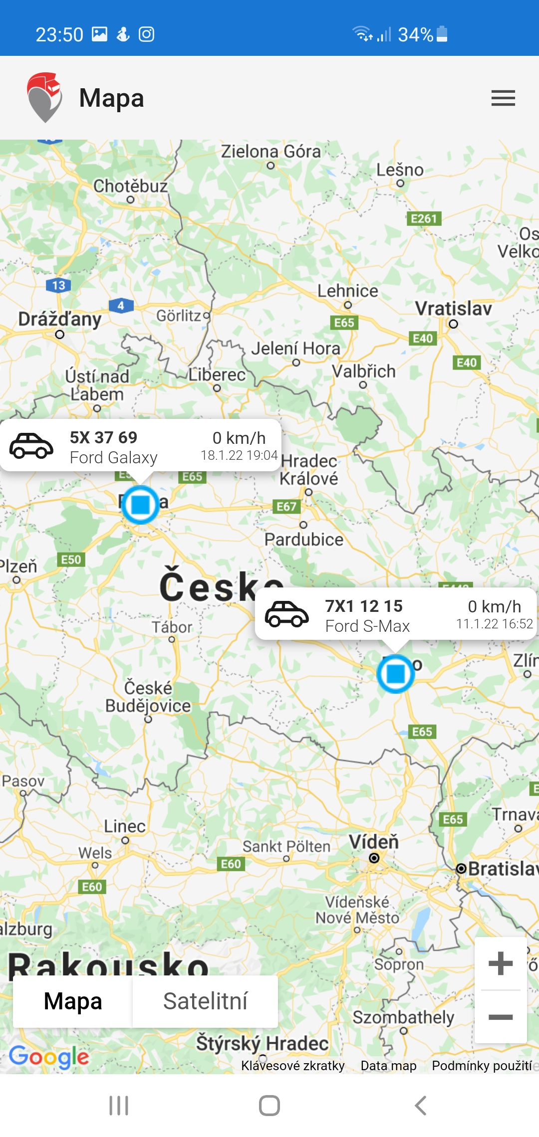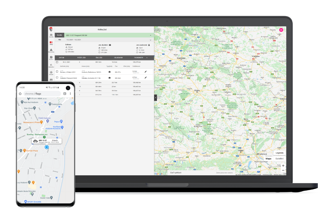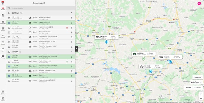 Zobrazení polohy monitorovaných vozidel na úvodní obrazovce včetně informace, zda je vozidlo v pohybu nebo spojí s vypnutým zapalováním. Aktualizace polohy vozidla každých 30 sekund a to na celém území Evropské unie v základní ceně služby.
