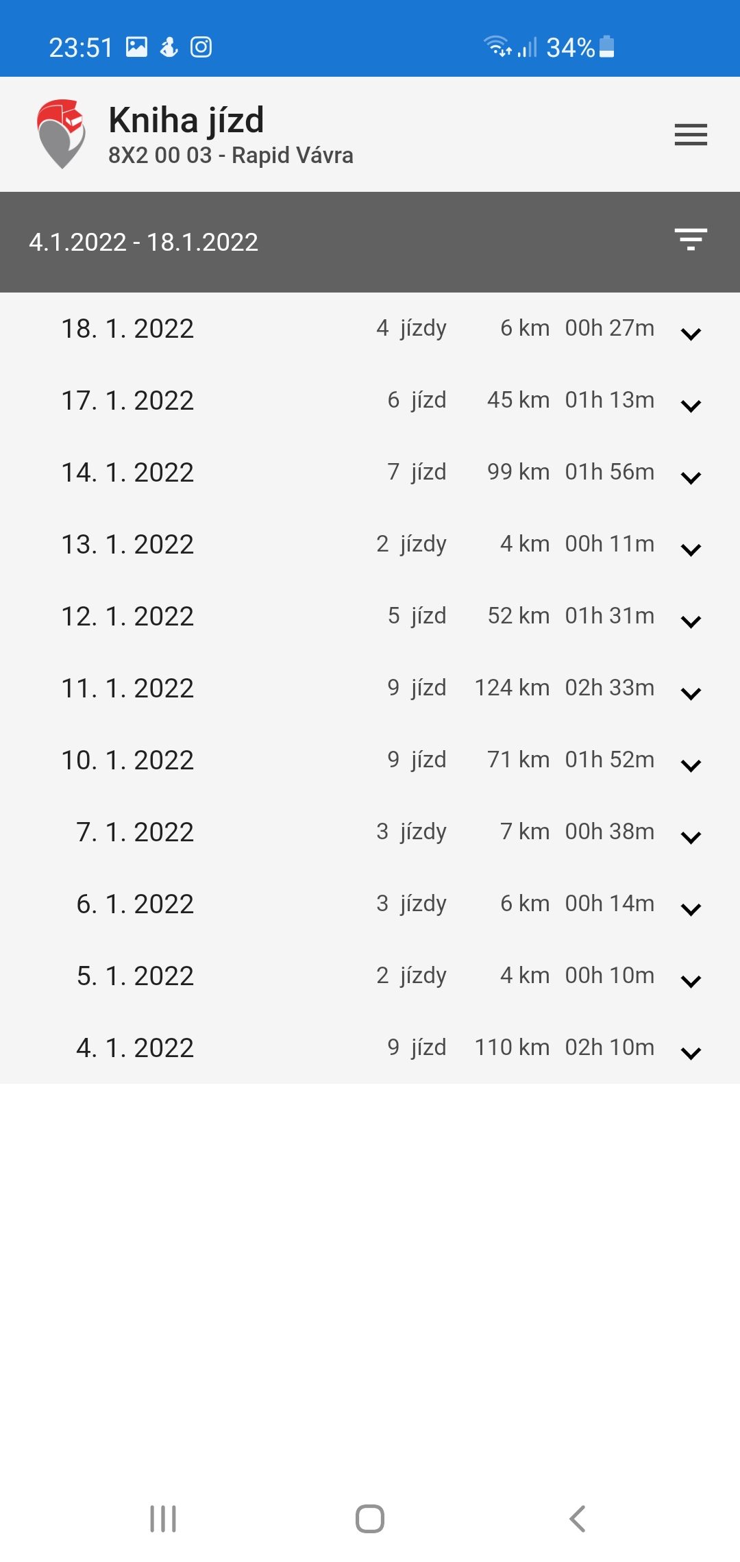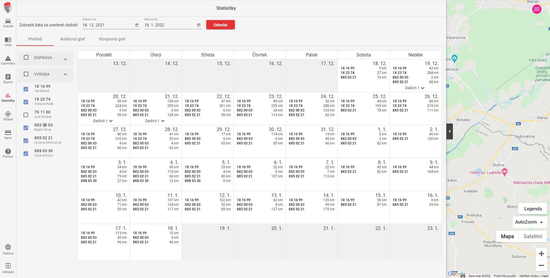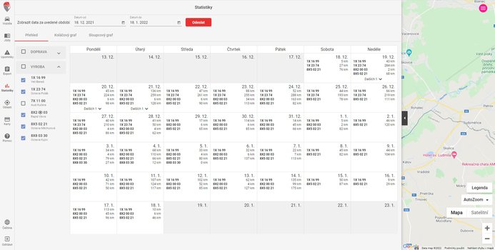 Přehledná statistika o využití jednotlivých vozidel a ujetých kilometrech.