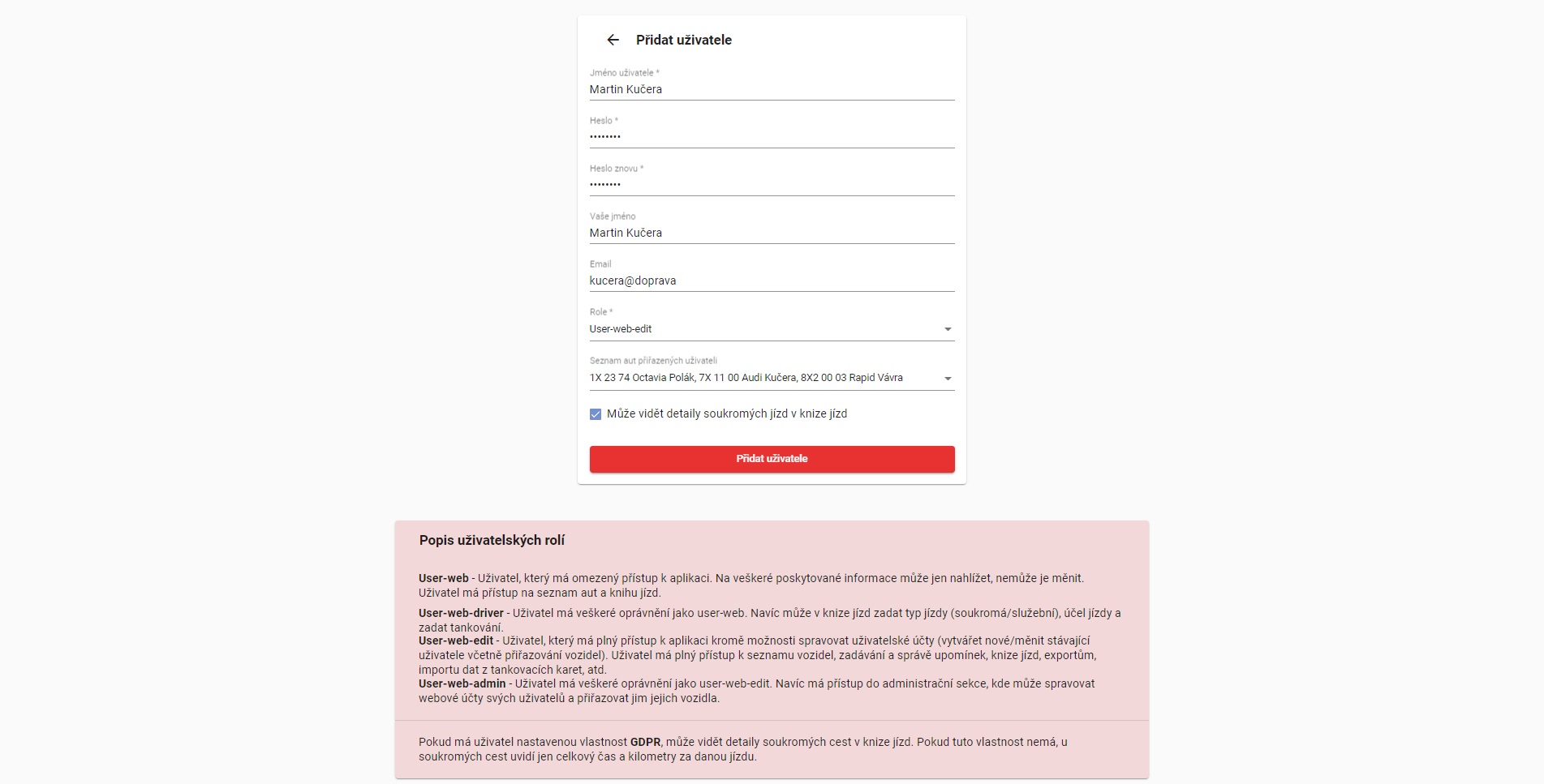 Uživatelské účty jsou rozděleny do několika úrovní. Od možnosti pouhého prohlížení až po administrátora, který vytváří další uživatelské účty, přiděluje práva a jednotlivá vozidla.