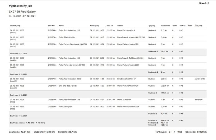 Přehledné rozdělení do jednotlivých dnů vč. souhrnných informací. Grafické zobrazení projetých tras ve zvolených mapách. Zaznačení rychlosti jízdy s možností zpětného přehrání jízdy. Filtrování služebních a soukromých jízd, hromadné úpravy nebo možnost uzamknutí jízd při závěrce daného období.Reporty